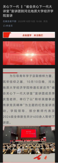 2025年10月15日,石家庄市委老干部局公众号“石家庄老干部”以“‘省会关心下一代大讲堂’宣讲团到yl23455永利宣讲”为题,对我院特邀宣讲团成员李庆雪举行“聆听英雄事迹,传承党员精神”为主题的宣讲活动进行了报道。